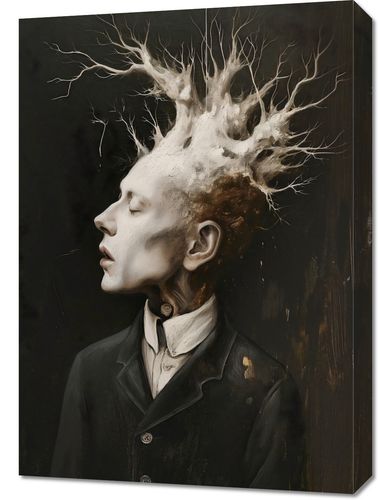 Obraz z serii abstrakcja zatytułowany Myśli Wzrastające prezentuje surrealistyczny portret mężczyzny, z którego głowy wyłania się skomplikowana struktura przypominająca korzenie lub gałęzie drzewa. Ten organiczny koronament wyrasta z myśli postaci, symbolizując rozwój, kreatywność i złożoność ludzkiego umysłu. Kontrast między żywą bielą i szarościami struktury a głębokim, ciemnym tłem sugeruje głębię i intensywność wewnętrznego świata postaci. Ten obraz może stanowić mocny wizualny akcent w przestrzeniach takich jak galerie, artystyczne pracownie, gabinety psychologiczne, a także we wnętrzach osób ceniących głębokie, filozoficzne refleksje.
