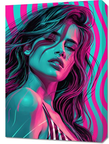 Obraz z serii pop art zatytułowany Neonowy Wzrok. Przedstawia on postać kobiety w stylu neonowej fantazji, z jej włosami i konturami twarzy podświetlonymi żywymi barwami cyjanu i różu na tle hipnotyzujących, pulsujących linii. Dynamiczna kompozycja i odważne kolory odzwierciedlają witalność i energię, jednocześnie wprowadzając element futurystycznego stylu. Ten obraz jest doskonałym uzupełnieniem nowoczesnego wnętrza, które chce wprowadzić mocny, wizualny akcent, idealny do miejskich loftów, salonów mody lub awangardowych przestrzeni galerii.