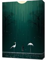 Obraz z serii wnętrza zatytułowany Nocne Marzenia. Scena przedstawia tajemniczą postać mężczyzny stojącego obok białej czapli, obaj są zanurzeni w wodzie i skierowani ku jasnoświecącemu księżycowi. Delikatne krople deszczu spadają z nieba, tworząc subtelną melodię natury, podczas gdy zarysy drzew rzucają cienie na monochromatyczne tło. Biały parasol unoszący się nad wodą dodaje elementu nieoczekiwanej magii i tajemniczości. Ta głęboka i metaforyczna kompozycja idealnie pasuje do nowoczesnych galerii sztuki, medytacyjnych przestrzeni oraz salonów czytania, gdzie cisza i kontemplacja dominują nad zgiełkiem codzienności.