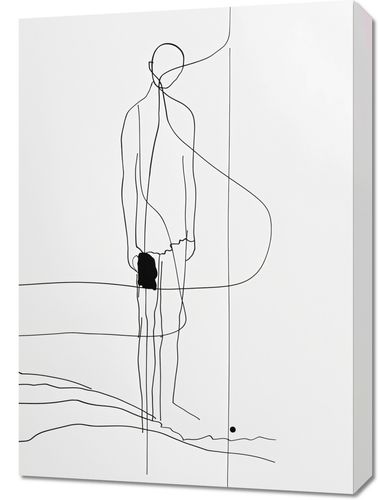 Obraz z serii minimalistyczne zatytułowany Samotna Wędrówka. Obraz przedstawia postać człowieka przedstawionego za pomocą zredukowanych linii, która wyraża elegancję i prostotę. Postać z dużym plecakiem jest uchwycona od tyłu, sugerując podróż lub długą wędrówkę. Linie przypominające krajobraz na dole obrazu i pojedynczy czarny punkt mogą symbolizować dalekie cele lub przemyślenia wędrowca. Ten minimalistyczny rysunek wprowadzi do wnętrza atmosferę refleksji i poszukiwania, będąc doskonałym wyborem do przestrzeni, które inspirują do myślenia i odkrywania, takich jak gabinety, studia czy nawet miejsca publiczne, gdzie sztuka ma za zadanie pobudzać do przemyśleń.