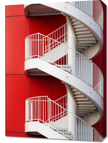 Obraz z serii wnętrza zatytułowany Schody do Niebios. Ten obraz to dynamiczne zestawienie białej, spiralnej klatki schodowej z intensywnie czerwonym tłem ściany budynku. Czyste linie, krzywe i kolorystyczny kontrast tworzą wyrafinowaną kompozycję, która łączy funkcjonalność z estetyką. Idealny dla nowoczesnych przestrzeni komercyjnych i mieszkalnych, które chcą wnieść element współczesnego designu i architektonicznej odwagi, ten plakat jest doskonałym wyborem dla miłośników designu, architektów oraz wszystkich, którzy cenią sobie wyrazistość i mocne, wizualne wrażenie.