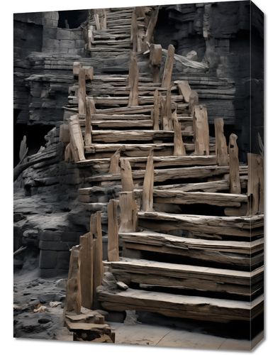 Obraz z serii pejzaże zatytułowany Schody do Nieznanego. Ten tajemniczy i intrygujący obraz przedstawia prymitywne, drewniane schody prowadzące w górę przez strukturę przypominającą starożytną ruiny lub naturalne formacje skalne. Zanurzone w półmroku, schody te wydają się zapraszać odkrywców do podjęcia podróży w nieznane, pełnej nieoczekiwanych odkryć. Obraz ten idealnie oddaje uczucie odkrycia i przygody, idealny dla przestrzeni zainspirowanych historią, naturą, czy literaturą eksploracyjną. Może stanowić inspirujący element w domach, biurach, a także w przestrzeniach publicznych takich jak kawiarnie tematyczne lub księgarnie.