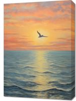 Obraz z serii pejzaże zatytułowany Serenada Nieba. Ten olśniewający obraz przedstawia moment, gdy ostatnie promienie dnia malują niebo w odcienie pomarańczy i różu, a pojedynczy ptak szybuje w stronę zachodzącego słońca. Morze rozciąga się aż po horyzont, odbijając złote światło, które nadaje scenie poczucie nieskończoności i spokoju. Doskonale nadaje się do wnętrz, które aspirują do stworzenia atmosfery spokoju i refleksji, takich jak salony, pokoje wypoczynkowe, czy przestrzenie wellness i spa.