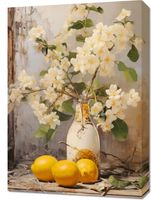 Obraz z serii wnętrza zatytułowany Słodkie Chwile. Delikatne białe kwiaty o subtelnym żółtym środku rozkwitają pełnym blaskiem obok dojrzewających cytryn, które wyróżniają się na tle w delikatnych pastelowych odcieniach. Starannie postarzana butelka i rustykalne drewno dodają nuty nostalgii i spokoju do tej kompozycji. Delikatna gra światła i cienia tworzy głęboką atmosferę i dodaje ciepła do sceny. Świetnie sprawdzi się w kawiarniach o prowansalskim stylu, domowych jadalniach dla tych, którzy pragną dodać do swojej przestrzeni odrobinę wiejskiego uroku, czy też w hotelach, gdzie chce się podkreślić elegancję i ciepło naturalnych elementów.