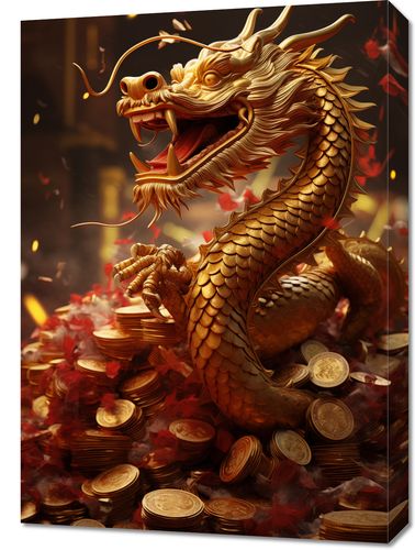 Obraz z serii motywy wschodnie zatytułowany Smok Bogactwa. Ilustracja ta ukazuje potężnego złotego smoka, symbol siły i pomyślności w wielu kulturach wschodnich, unoszącego się nad skarbami. Smok, z szeroko otwartymi szczękami, wydaje się ryczeć triumfalnie, otoczony przez wirujące złote monety i kwiaty, co dodaje kompozycji dynamizmu. Żywe kolory i szczegółowe wykonanie smoka sprawiają, że obraz jest pełen życia i energii. Obraz ten jest doskonałym wyborem dla miłośników sztuki orientalnej oraz jako element dekoracyjny wnętrz, które chcą wprowadzić elementy bogatej symboliki i kulturowej głębi, takich jak domowe biura, pokoje do medytacji czy ekskluzywne salony.