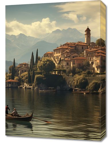 Obraz z serii pejzaże zatytułowany Spokojna Nostalgia, ten urzekający pejzaż przenosi nas do sielankowej wioski nad jeziorem, gdzie czas zdaje się płynąć wolniej. Łagodne światło rozlewające się nad architekturą wioski i gładką powierzchnią wody tworzy poczucie ciepła i spokoju. Para przemieszczająca się łodzią dodaje element ludzki, harmonijnie wpisując się w krajobraz. To dzieło sztuki idealnie nadaje się do przestrzeni, które mają na celu wprowadzenie atmosfery spokoju i refleksji, takich jak biblioteki, poczekalnie lub prywatne gabinety, zapewniając odprężającą ucieczkę od codziennego zgiełku.