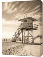 Obraz z serii pejzaże zatytułowany Strażnik Wydm. Prezentuje on sepiową scenę z wieżą ratownika na pustej plaży. Nostalgiczna tonacja obrazu podkreśla samotność struktury i piękno otaczającej ją dzikiej przyrody. Dramatyczne chmury na niebie i ślady na piasku prowadzą wzrok ku wieży, dodając głębi i historii miejscu. Ten obraz idealnie nadaje się do wnętrz, w których pragnie się wywołać uczucie spokoju, przestrzeni i czasów minionych, takich jak salony, pokoje wypoczynkowe, a także przestrzenie publiczne lub prywatne biura, które cenią sobie klasyczny wygląd i atmosferę.