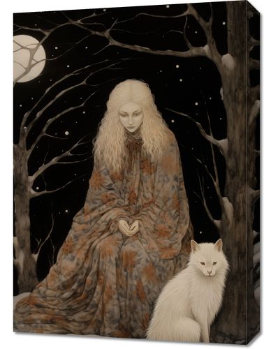Obraz z serii wnętrza zatytułowany Stróżka Leśna. Ta eteryczna praca artystyczna ukazuje postać kobiecą, owiniętą w szatę z motywem leśnym, zatopioną w kontemplacji pod gałęziami drzew oplecionych przez śnieg i w blasku pełnego księżyca. Jej spokojna obecność i blady odcień skóry kontrastują z ciemnością nocy, a towarzyszący jej biały wilk dodaje elementu dzikości i tajemniczości. Obraz oddaje uczucie spokoju i jedności z naturą, a jednocześnie wzbudza ciekawość dotyczącą ukrytych opowieści i starych legend. Idealny dla miłośników fantastyki, mitologii, oraz tych, którzy pragną wprowadzić do swojego wnętrza elementy oniryczne i magiczne.