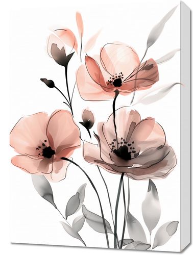 Obraz z serii wnętrza zatytułowany Subtelny Okaz to artystyczna interpretacja delikatnych kwiatów maku. Ilustracja przedstawia kwiaty w pastelowych odcieniach różu i pomarańczy z subtelnymi szarości i akcentami czerni, co nadaje kompozycji miękkiego i eterycznego charakteru. Przezroczyste płatki z lekko zarysowanymi konturami są przedstawione na tle w tonacji jasnego beżu, co pozwala na pełne skupienie na delikatności i pięknie kwiatów. Wykorzystanie minimalizmu i delikatności kolorów sprawia, że obraz emanuje spokojem i elegancją. Idealny do przestrzeni, które cenią sobie spokój i naturę, takich jak salony spa, pokoje gościnne, czy jadalnie, gdzie może dodać odrobinę subtelnego uroku i świeżości.