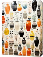 Obraz z serii wnętrza zatytułowany Symfonia Wazonów. Wspaniałe wazony w bogatej palecie kolorów, od głębokiej czerni do ciepłych odcieni pomarańczu, tworzą intrygującą mozaikę wzorów i kształtów. Delikatne motywy roślinne, które zdobią niektóre wazony, dodają uroku i lekkości, a różnorodność wzorów i faktur przyciąga wzrok i zaprasza do głębszej refleksji. Kontrast między jasnymi i ciemnymi barwami, a także subtelne niuanse w każdym wazonie, dodają tej kompozycji głębi i dramatu. Ten artystyczny plakat doskonale wpisuje się w klimat wyrafinowanych galerii sztuki, eleganckich kawiarni oraz nowoczesnych przestrzeni mieszkalnych, które stawiają na unikatowy design.