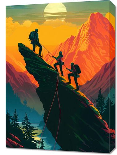 Obraz z serii abstrakcja zatytułowany U Szczytu przedstawia grupę wędrowców wspólnie zdobywających szczyt górski przy zachodzie słońca. Scena jest nasączona żywymi odcieniami pomarańczy i czerwieni, które tworzą dramatyczny, ale piękny kontrast z ciemnozielonymi drzewami i skalistym terenem. Sylwetki wędrowców są w centrum kompozycji, wyraźnie zarysowane przeciwko tłu światła słonecznego, co podkreśla ich osiągnięcie i trud włożony w zdobycie szczytu. Przepiękny zachód słońca z dużym, jasnym słońcem na horyzoncie nadaje całej scenie uczucie spokoju i spełnienia. Obraz ten oddaje ducha przygody i piękno natury, idealny dla miłośników gór i tych, którzy cenią siłę ludzkiego ducha. Doskonały do dekoracji ścian w domach, schroniskach górskich lub jako inspiracja w przestrzeniach, gdzie docenia się przyrodę i aktywny tryb życia.