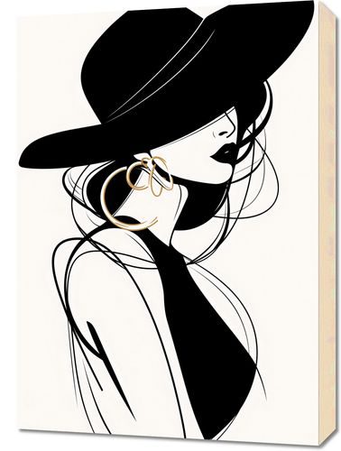 Obraz z serii minimalistyczne zatytułowany Uwikłana Elegancja. Grafika przedstawia sylwetkę tajemniczej, eleganckiej postaci w szerokim kapeluszu, co nadaje kompozycji aurę wyrafinowania i gracji. Stylizowany portret, wykonany czernią i bielą z akcentami złota, emanuje klasyką i nowoczesnością. Silny kontrast i płynne linie podkreślają zmysłowy kształt ujęcia oraz wytworność biżuterii, sugerując wyrafinowany gust i pewność siebie modelki. Obraz ten idealnie wpasuje się w eleganckie wnętrza, gdzie klasyka spotyka się z nowoczesnością, doskonale nadając się do salonów, sypialni, garderoby lub jako elegancki akcent w przestrzeniach komercyjnych, takich jak salony piękności czy butiki.