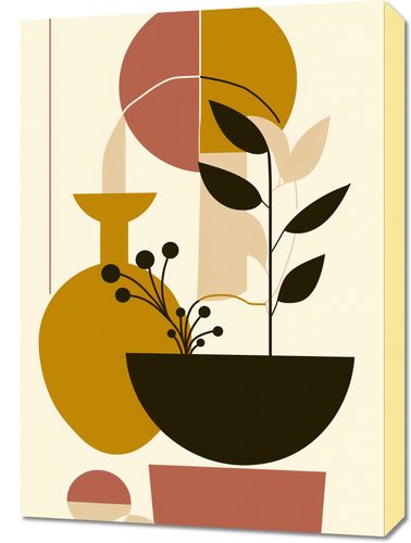 Obraz z serii minimalistyczne zatytułowany Wielkość Natury. Zaprezentowana jest tutaj elegancka kompozycja roślin w prostym naczyniu, zestawiona z geometrycznymi blokami kolorów w ciepłej, naturalnej palecie. Przywodzi ona na myśl harmonię i zorganizowaną prostotę, które można znaleźć w naturze, jak również w ludzkich tworach. Elementy w kształcie koła i półkola nadają kompozycji spokoju i równowagi, a linie i bloki kolorów tworzą poczucie głębi i struktury. Ten obraz będzie idealny do wnętrz, gdzie ceni się porządek i minimalistyczne podejście do dekoracji, wnosząc jednocześnie elementy natury i spokoju. Idealny do umieszczenia w przestrzeniach takich jak nowoczesne salony, eleganckie gabinety, lub jako spokojne tło w przestrzeniach biurowych.