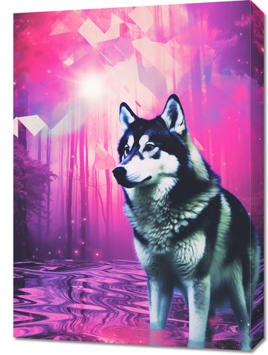 Obraz z serii pop art zatytułowany Wilczy Duch. Ta hipnotyzująca grafika łączy w sobie realistyczny wizerunek wilka z eterycznym, neonowym lasem w tle, co nadaje scenie onirycznego, mistycznego charakteru. Wilk, przedstawiony w pełnym majestacie, stoi na brzegu zaczarowanego jeziora, a tajemnicze, geometryczne kształty unoszą się w powietrzu, dodając kompozycji elementu fantastyki. Wyraziste kolory różu i fioletu tworzą niemal bajkową atmosferę. Obraz jest idealnym wyborem dla miłośników natury i jej mistycznych aspektów, świetnie nadaje się do wnętrz o tematyce przyrodniczej, pokojów dla młodzieży, lub jako unikatowy element dekoracyjny w przestrzeniach współczesnych.