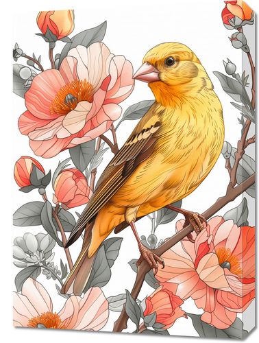 Obraz z serii natura zatytułowany Wiosenny Śpiewaczek przedstawia pełną detali i życia scenę, w której jaskrawo żółty ptak, przypominający kanarka, spoczywa na gałęzi wśród kwitnących kwiatów. Delikatne i subtelne kolory kwiatów w pastelowych odcieniach różu i pomarańczu tworzą miękki kontrast do żywego upierzenia ptaka. Precyzyjne linie i staranne cieniowanie nadają ilustracji realistycznego wyglądu, a roślinność w tle jest równie szczegółowo wykonana, co dodaje kompozycji głębi i bogactwa. Ten obraz to celebracja wiosennego odrodzenia i piękna natury, idealny do ożywienia każdego wnętrza, szczególnie pokoju dziennego, przestrzeni odpoczynkowej lub kawiarni o przytulnej atmosferze.