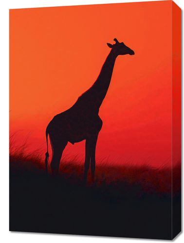 Obraz z serii natura zatytułowany Żyrafa w Czerni. Przedstawia majestatyczną sylwetkę żyrafy na tle zachodzącego słońca. Intensywny czerwony kolor nieba tworzy dramatyczne tło dla czarnej sylwetki, która wyłania się wśród wysokich traw sawanny. Subtelny gradient czerwieni przywołuje ciepło afrykańskiego słońca i dzikość naturalnego środowiska. Obraz idealnie oddaje esencję dzikiej przyrody i będzie pięknym dodatkiem do każdego wnętrza, przyciągając wzrok i inspirując do marzeń o podróżach. Doskonale pasuje do salonów w stylu etno, przestrzeni publicznych związanych z podróżami oraz pokojów o tematyce przyrodniczej.