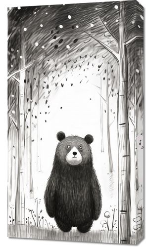 Obraz z serii wnętrza zatytułowany Ciekawski Miś. Ten uroczy obraz ilustracyjny przedstawia przyjaznego, czarno-białego misia stojącego na dwóch nogach w środku leśnej polany, patrzącego z ciekawością w górę na delikatnie opadające płatki śniegu. Stylizowany na rysunek piórkiem z miękkimi odcieniami szarości, wprowadza atmosferę spokoju i zaciekawienia naturą. Idealny do ozdoby pokoju dziecięcego, jako element dekoracyjny w przestrzeniach edukacyjnych lub jako ciepły akcent w domowych salonach.