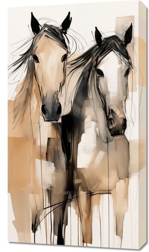 Obraz z serii wnętrza zatytułowany Dusze na Wolności. Ten artystyczny obraz przedstawia dwie abstrakcyjne sylwetki koni, uchwycone w dynamicznych, niemal eterycznych pociągnięciach pędzla. Neutralna paleta barw z dominującymi odcieniami beżu i czerni, podkreślona jest przez akcenty i plamy, co nadaje dziełu głębi i tekstury. Artystyczne, swobodne linie i plamy tuszu tworzą wrażenie ruchu i wolności, wywołując emocjonalne rezonanse z widzem. Obraz jest idealnym wyborem dla miłośników koni, sztuki współczesnej i abstrakcyjnego ekspresjonizmu, będąc nie tylko dekoracją, ale także wyrafinowanym elementem w przestrzeniach takich jak salony, biura, czy galerie sztuki.