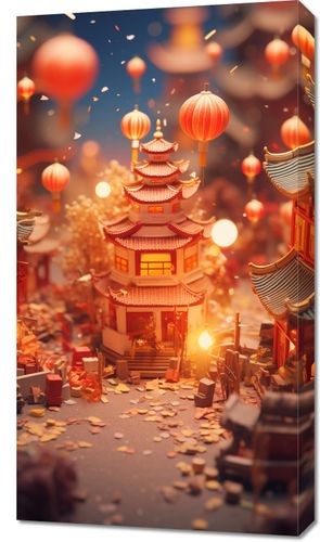 Obraz z serii motywy wschodnie zatytułowany Festiwale Świata. Ta urocza i ciepła kompozycja przedstawia tradycyjny azjatycki dom w sercu starożytnego miasta, rozświetlonego przez setki lampionów unoszących się w powietrzu, co nadaje scenie atmosferę świętowania i radości. Subtelne światło i złote konfetti na pierwszym planie tworzą efekt głębi i magicznego blasku. Obraz ten wprowadza do wnętrza ducha azjatyckiej kultury i jest doskonałym dodatkiem do przestrzeni, które chcą uczcić piękno i tradycję festiwali latarni, takich jak restauracje, salony spa lub jako wyjątkowy akcent w domowych salonach.