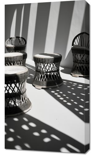 Obraz z serii wnętrza zatytułowany Gra Świateł to stylowa, monochromatyczna fotografia, która oddaje estetykę współczesnego designu. Na fotografii widzimy zestaw eleganckich, plecionych stołków z rattanu ustawionych na tle geometrycznych cieni. Ostre linie cieni przełamują okrągłe kształty mebli, tworząc fascynującą kompozycję pełną kontrastów. Białe siedziska stołków pięknie kontrastują z ciemniejszymi elementami, a gra światła i cienia nadaje scenie trójwymiarowość i teksturę. Obraz ten będzie doskonały dla miłośników minimalistycznych wnętrz, a także dla osób poszukujących elementu dekoracyjnego, który wprowadzi do pomieszczenia nowoczesny i artystyczny akcent. Idealny do nowoczesnych przestrzeni mieszkalnych, biur, kawiarni lub galerii sztuki.
