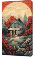 Obraz z serii wnętrza zatytułowany Idylla Rustykalna. Ten ciepły i urokliwy obraz przedstawia sielski dom otoczony przez bujny krajobraz w odcieniach czerwieni i pomarańczy, których intensywność podkreśla zachodzące słońce w tle. Kompozycja łączy w sobie elementy klasycznego amerykańskiego krajobrazu z nostalgicznym uczuciem, które przywodzi na myśl długie, leniwe popołudnia na wsi. Ilustracja ta idealnie nadaje się do nadania charakteru i ciepła każdemu wnętrzu, doskonale pasując do przestrzeni mieszkalnych, kawiarni lub pensjonatów, które chcą zaakcentować swoje powiązania z naturą i wiejskim spokojem.