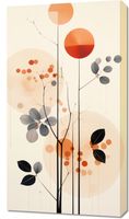 Obraz z serii wnętrza zatytułowany Jesienna Melodia. Subtelne motywy roślinne, z delikatnymi liśćmi w odcieniach niebieskiego, są otoczone przez okrągłe formy w odcieniach pomarańczy i beżu, które przypominają wschodzące słońce czy pełnię księżyca. Cienkie gałązki przecinają kompozycję, dodając jej struktury i rytmu. Ciepłe tony mieszają się z chłodniejszymi, tworząc harmonijną i spokojną całość. Jego wyrafinowany i subtelny design wprowadza atmosferę relaksu i spokoju. Idealnie pasuje do domowych salonów, gabinetów relaksacyjnych czy też nowoczesnych biur, gdzie natura łączy się z elegancją i prostotą.
