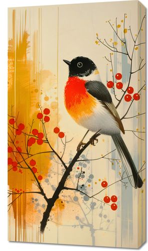 Obraz z serii abstrakcja zatytułowany Jesienny Rudzik przedstawia kolorowego ptaka, prawdopodobnie rudzika, siedzącego na gałęzi w otoczeniu jesiennych owoców i liści. Ptak jest szczegółowo narysowany z wyraźnymi kolorami, podkreślającymi jego piękno i elegancję, a jego poza jest pełna wdzięku i spokoju. Tło obrazu w ciepłych odcieniach żółci i oranżu, przypomina złotą paletę jesieni, z akcentami w postaci delikatnych kropelek i smug farby, które dodają dziełu głębi i tekstury. Całość kompozycji jest harmonijna i pełna spokoju, idealna do przestrzeni, które chcą wnieść element natury i spokojnego piękna do swojego wnętrza, takich jak salony, gabinety relaksacyjne, czy przestrzenie o tematyce przyrodniczej.