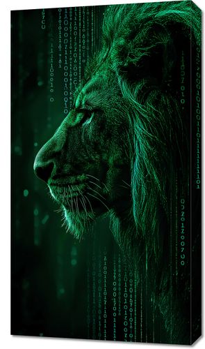 Obraz z serii pop art zatytułowany Kod Siły. Prezentuje majestatyczne oblicze lwa zanurzone w cyfrowym kodzie, który spływa w dół jak deszcz binarny, łącząc siłę i surowość natury z precyzją i logiką technologii. Zielonkawe światło podkreśla kontury i muskulaturę króla zwierząt, a cyfrowe elementy otulają jego profil, sugerując połączenie organicznego i syntetycznego świata. Ten obraz idealnie wpisuje się w nowoczesne, technologiczne przestrzenie, takie jak nowoczesne biura, pokoje gamingowe lub innowacyjne przestrzenie edukacyjne, oferując inspirację i refleksję nad współczesnym związkiem człowieka z technologią.