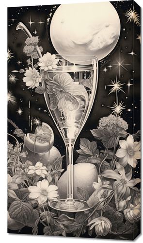 Obraz z serii wnętrza zatytułowany Kosmiczny Eliksir. Niesamowita kompozycja przedstawiająca kieliszek, z którego wylewa się galaktyczny nektar, otoczony kwiatami i roślinami w monochromatycznych barwach. Centralnym punktem jest lśniąca pełnia księżyca, której blask odbija się w szkle, tworząc atmosferę tajemnicy i magii. Gwiazdy migoczą w tle, nadając całości głębokiego, nieskończonego wymiaru. Delikatne linie i szczegóły graficzne wzbogacają kompozycję, czyniąc ją idealnym wyborem do nowoczesnych salonów, galerii sztuki oraz miejsc o tematyce astronomicznej.