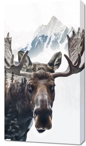 Obraz z serii natura zatytułowany Łoś Duch Lasu to majestatyczne przedstawienie łosia, którego potężne poroże przeobraża się w górski krajobraz. Na pierwszym planie widzimy głęboki, przenikliwy wzrok łosia, skupionego na widzu, z pięknymi, szczegółowo odwzorowanymi detalami sierści. Jego rozłożyste poroże płynnie przeistacza się w ośnieżone szczyty, co symbolizuje jego władzę i jedność z dziką przyrodą. Jasne, lekko zamglone tło sugeruje poranne światło, dodając plakatowi poczucia tajemnicy i dzikiego piękna. Ten obraz doskonale sprawdzi się w przestrzeniach inspirowanych naturą, takich jak chaty górskie, domy myśliwskie, lub jako wyraz głębokiego szacunku dla dzikiej przyrody w salonach i przestrzeniach wspólnych miłośników natury.