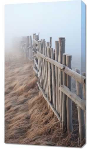 Obraz z serii pejzaże zatytułowany Mgła nad Wydmami. Prezentuje on eteryczny widok na drewniane ogrodzenie, które wiedzie przez poszarpane, suchą trawę wydm. Delikatna mgła otula scenę, nadając jej tajemniczość i spokój, a subtelne odcienie szarości i beżu tworzą uczucie miękkości i ciepła. Ten obraz idealnie oddaje atmosferę wyciszenia i rozmyślania, sprawiając, że jest doskonałym wyborem dla przestrzeni, które mają na celu uspokojenie i relaks, jak spa, pokoje medytacyjne, czy ciche kąciki w domach. To także piękny element dekoracyjny dla wnętrz inspirowanych naturą i spokojem przyrody.
