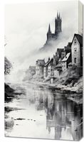 Obraz z serii pejzaże zatytułowany Mglisty Refleks. Misterne pociągnięcia pędzla przedstawiają starą wieś schowaną w mrocznych zakątkach gór, z dominującymi wieżami kościoła wznoszącymi się nad nią. Mgła otulająca krajobraz i odbicie w spokojnej wodzie tworzą atmosferę tajemniczości i zadumy. Monochromatyczna paleta barw dodaje głębi i intensywności całemu obrazowi, czyniąc go idealnym wyborem dla klasycznych salonów oraz miejsc takich jak kawiarnie o historycznym charakterze czy ekskluzywne kluby dyskusyjne.