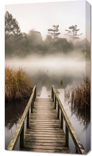 Obraz z serii pejzaże zatytułowany Most do Tajemnicy. Na tym mistycznym obrazie drewniana kładka prowadzi nas ku tajemniczej mgle, która delikatnie spowiła powierzchnię spokojnego stawu. Złote trzciny i zarysy drzew rzucają się w oczy na tle zamglonego poranka, tworząc uczucie ciepła i spokoju. Ten obraz oddaje piękno niewidzialnego świata, który czai się tuż za zasłoną mgły, zachęcając widza do refleksji i odkrywania nieznanego. Idealnie nadaje się do wnętrz, gdzie dominuje natura i spokój, takich jak salony spa, pokoje relaksacyjne, czy prywatne biblioteki. To wyjątkowy element dekoracyjny, który może przynieść element kontemplacji i odprężenia do każdego domu lub przestrzeni publicznej.