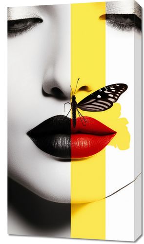 Obraz z serii abstrakcja zatytułowany Motyla Piękność. Ten obraz przedstawia twarz kobiety podzieloną na dwa kontrastujące segmenty: jeden w czerni i bieli, drugi w żywych kolorach z motylem na ustach. Ilustracja eksploruje temat dualizmu natury ludzkiej, piękna i jego zmienności. Obraz ten jest idealnym wyborem dla przestrzeni o współczesnym designie, takich jak salony piękności, studia artystyczne, a także jako wyrazisty element dekoracyjny w nowoczesnych domach.