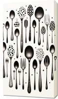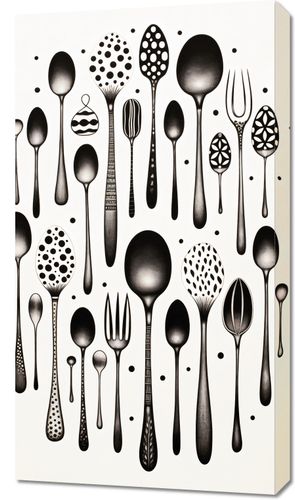 Obraz z serii wnętrza zatytułowany Narzędzia Smaku. Eleganckie sylwetki sztućców w różnorodnych kształtach i wzorach, podkreślane przez subtelne detale i geometryczne punkty, tworzą harmonijną i równocześnie zaskakującą kompozycję. Czarne i białe tony nadają prostotę i wyrafinowanie, podczas gdy unikalne projekty sztućców dodają nuty kreatywności i innowacji. Idealnie sprawdzi się w nowoczesnych kuchniach, restauracjach o minimalistycznym designie oraz w przestrzeniach dedykowanych sztuce kulinarnej.