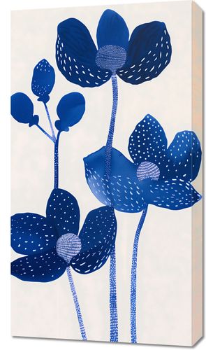 Obraz z serii wnętrza zatytułowany Nocne Kwiaty to odważne, graficzne przedstawienie kwiatów w monochromatycznej palecie kolorów granatowych. Kwiaty o stylizowanych formach i różnorodnych fakturach wyłaniają się na tle w delikatnym odcieniu, co dodaje kompozycji spokojnego, ale zarazem wyrazistego charakteru. Sploty i kropki na płatkach kwiatów tworzą iluzję głębi i tekstury, a ich symetryczny rozmieszczenie nadaje plakatowi rytmicznej harmonii. Ten obraz jest wyrafinowany i współczesny, idealny dla przestrzeni szukających minimalistycznej, ale odważnej dekoracji ściennych, takich jak nowoczesne biura, eleganckie salony czy jako wyjątkowy element w galeriach sztuki.