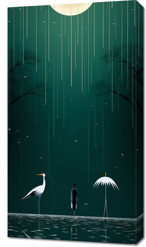 Obraz z serii wnętrza zatytułowany Nocne Marzenia. Scena przedstawia tajemniczą postać mężczyzny stojącego obok białej czapli, obaj są zanurzeni w wodzie i skierowani ku jasnoświecącemu księżycowi. Delikatne krople deszczu spadają z nieba, tworząc subtelną melodię natury, podczas gdy zarysy drzew rzucają cienie na monochromatyczne tło. Biały parasol unoszący się nad wodą dodaje elementu nieoczekiwanej magii i tajemniczości. Ta głęboka i metaforyczna kompozycja idealnie pasuje do nowoczesnych galerii sztuki, medytacyjnych przestrzeni oraz salonów czytania, gdzie cisza i kontemplacja dominują nad zgiełkiem codzienności.
