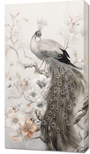 Obraz z serii wnętrza zatytułowany Pawia Gracja. Ta grafika przedstawia majestatycznego pawia spoczywającego na gałęzi, otoczonego przez delikatne kwiaty magnolii. Kunsztownie oddane detale piór i kwiatów w pastelowej palecie barw tworzą uczucie spokoju i harmonii. Obraz ten jest idealny dla miłośników piękna natury i sztuki, doskonale nadaje się do wnętrz o klasycznej i eleganckiej estetyce, takich jak salon, sypialnia, a także jako wyjątkowy element dekoracyjny w spa lub miejscach relaksacji.