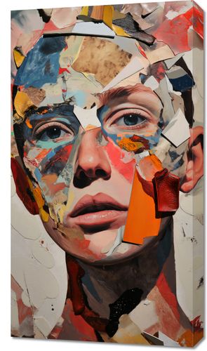 Obraz z serii abstrakcja zatytułowany Podział Samego Siebie, przedstawia twarz złożoną z rozmaitych, nieregularnych kawałków, które łączą się w zaskakująco spójną całość. Każdy fragment jest jak pociągnięcie pędzla, pełne tekstury i żywych kolorów, od ciepłych odcieni pomarańczy i czerwieni, po subtelne biel i brąz. Wzrok widza jest przyciągany do intensywnych, realistycznych oczu, które wydają się obserwować z za rozdrobnionej mozaiki. Obraz ten mógłby znaleźć swoje miejsce w nowoczesnych galeriach sztuki, studiach projektowych, lub jako odważny akcent w minimalistycznych, współczesnych przestrzeniach. Jego abstrakcyjny, ale wyrazisty design stwarza punkt konwersacyjny i może być interpretowany jako komentarz do złożoności ludzkiej tożsamości i percepcji.