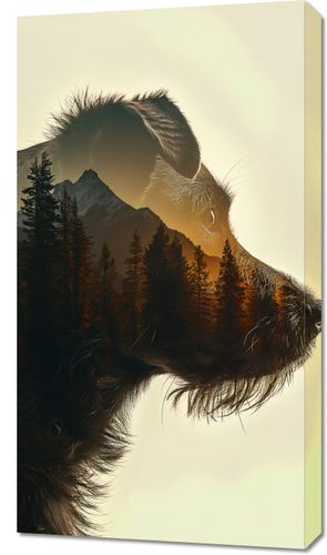 Obraz z serii natura zatytułowany Psi Duch Lasu ukazuje zjawiskowe połączenie sylwetki psa z krajobrazem górskim. Pięknie uchwycony profil psa, z jego czujnym spojrzeniem i delikatnymi liniami twarzy, płynnie przechodzi w malownicze góry, które wyłaniają się z jego sylwetki. Drzewa sosnowe i złociste światło zachodzącego słońca tworzą tło, które emanuje spokojem i harmonią. Kontur psa jest wyraźnie zarysowany, a jednocześnie subtelnie stapia się z przyrodą, co podkreśla nierozerwalną więź między zwierzętami a ich naturalnym środowiskiem. Ten obraz idealnie wpasuje się w wnętrza inspirowane naturą, w salonach miłośników zwierząt lub jako dekoracja w weterynaryjnych poczekalniach, przypominając o pięknie i sile natury oraz naszej odpowiedzialności za jej ochronę.