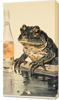 Obraz z serii motywy wschodnie zatytułowany Refleksje Błotniaka. Intrygujące spojrzenie żaby, podkreślane przez jasne, wyraziste oczy i lśniącą skórę, skontrastowane z delikatnym odbiciem w wodzie oraz subtelną butelką w tle, dodającego atmosfery spokoju i kontemplacji. Kolorowe detale butelki i intensywna zieleń żaby kontrastują z pastelowym tłem, wprowadzając do kompozycji nutę tajemniczości i głębokiego zastanowienia. Doskonale sprawdzi się w winiarniach o tematyce naturalnej oraz w przestrzeniach relaksacyjnych, takich jak salony spa czy ośrodki wellness.
