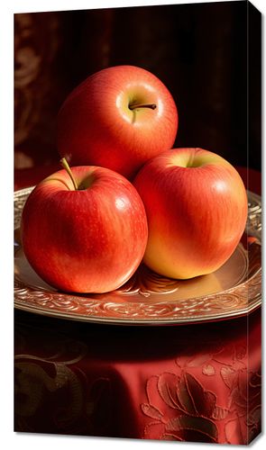 Obraz z serii natura zatytułowany Rubinowe Ekscesy. Trzy soczyste jabłka o lśniącej rubinowej skórce, delikatnie ułożone na antycznym srebrnym talerzu o bogato zdobionych brzegach. Każde jabłko jest uchwycone w pełni swojego naturalnego piękna, z delikatnymi refleksami światła podkreślającymi ich świeżość i kuszący wygląd. Tło z głębokim czerwonym brokatem, dodaje głębi i luksusu kompozycji. Obraz idealnie komponuje się w przestrzeniach kulinarnych, takich jak restauracje wysokiej klasy czy domowe kuchnie, gdzie podkreśla znaczenie estetyki w prezentacji potraw.