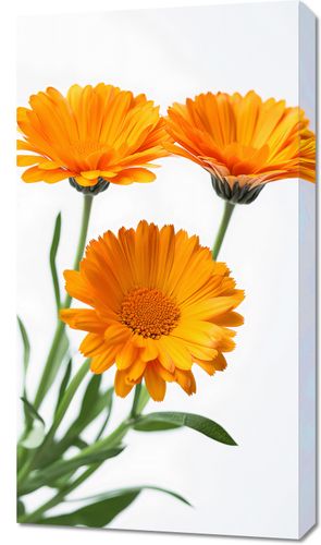 Obraz z serii wnętrza zatytułowany Słoneczne Kalendule. Zaprezentowano na nim trzy jaskrawe, żywiołowe kwiaty kalenduli, które rozkwitają na tle czystej bieli. Ich intensywnie pomarańczowe płatki i wyraziste, bogate środki stanowią symbol radości i optymizmu. Delikatne cienie i gra światła na płatkach dodają głębi i realizmu, sprawiając, że kwiaty wydają się niemal trójwymiarowe. Ten obraz może wprowadzić element natury i świeżości do każdego wnętrza, będąc idealnym wyborem dla przestrzeni, które cenią sobie jasność i lekkość, takich jak salony, pokoje relaksacyjne czy kliniki wellness.