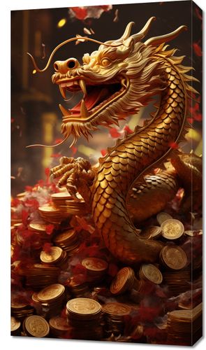 Obraz z serii motywy wschodnie zatytułowany Smok Bogactwa. Ilustracja ta ukazuje potężnego złotego smoka, symbol siły i pomyślności w wielu kulturach wschodnich, unoszącego się nad skarbami. Smok, z szeroko otwartymi szczękami, wydaje się ryczeć triumfalnie, otoczony przez wirujące złote monety i kwiaty, co dodaje kompozycji dynamizmu. Żywe kolory i szczegółowe wykonanie smoka sprawiają, że obraz jest pełen życia i energii. Obraz ten jest doskonałym wyborem dla miłośników sztuki orientalnej oraz jako element dekoracyjny wnętrz, które chcą wprowadzić elementy bogatej symboliki i kulturowej głębi, takich jak domowe biura, pokoje do medytacji czy ekskluzywne salony.