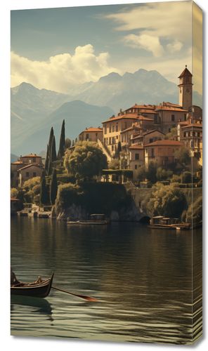 Obraz z serii pejzaże zatytułowany Spokojna Nostalgia, ten urzekający pejzaż przenosi nas do sielankowej wioski nad jeziorem, gdzie czas zdaje się płynąć wolniej. Łagodne światło rozlewające się nad architekturą wioski i gładką powierzchnią wody tworzy poczucie ciepła i spokoju. Para przemieszczająca się łodzią dodaje element ludzki, harmonijnie wpisując się w krajobraz. To dzieło sztuki idealnie nadaje się do przestrzeni, które mają na celu wprowadzenie atmosfery spokoju i refleksji, takich jak biblioteki, poczekalnie lub prywatne gabinety, zapewniając odprężającą ucieczkę od codziennego zgiełku.