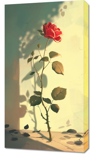 Obraz z serii abstrakcja zatytułowany Subtelność przedstawia pojedynczą, kwitnącą różę w subtelnie oświetlonym pomieszczeniu, które wprowadza atmosferę spokoju i refleksji. Delikatne światło przesączające się przez okno rzuca cienie liści na blady, ciepły tło, co nadaje scenie głębi i tekstury. Rozwinięty kwiat róży w pełnym rozkwicie, o intensywnie czerwonym kolorze, jest centralnym punktem kompozycji, symbolizującym zarówno delikatność, jak i siłę życia. Opadające płatki wokół smukłej łodygi tworzą poczucie ulotnego piękna i przemijania. Ten obraz doskonale sprawdzi się jako dekoracja w przestrzeniach promujących spokój i kontemplację, takich jak salony, pokoje relaksacyjne czy studia jogi.