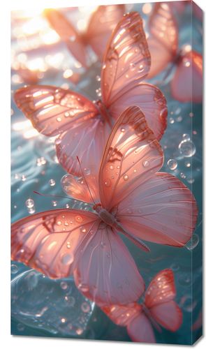 Obraz z serii natura zatytułowany Świetliste Motyle. Na obrazie widzimy delikatne motyle o przezroczystych, różowych skrzydłach, unoszące się nad wodą i łagodnie odbijające światło słoneczne. Kropelki wody na ich skrzydłach dodają uczucia świeżości i czystości. Obraz emanuje spokojem i pięknem, idealnie nadając się do przestrzeni, które chcą wprowadzić element relaksu i spokoju, takich jak spa, pokoje medytacyjne, a także jako łagodny element dekoracyjny do domu.