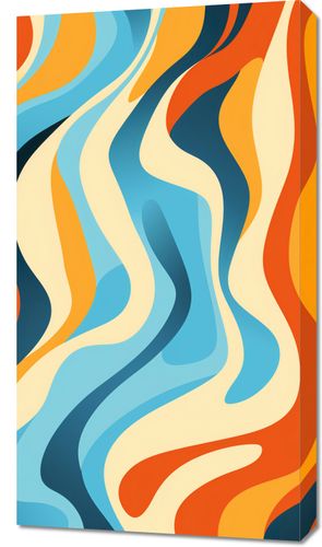 Obraz z serii abstrakcja zatytułowany Tańczące Fale. Kolorowe pasma falujące w rytmie niewidzialnej melodii, tworząc kalejdoskop błękitów, pomarańczy i beżów. Te meandryczne wzory przypominają wodne tanecznice, które wirowałyby w rytmie letniego brzasku. Ciepłe i chłodne tony kontrastują ze sobą, nadając obrazowi głębi i dynamiki. Będzie idealnym wyborem dla nowoczesnych apartamentów nad morzem, czy też kawiarni o śródziemnomorskim klimacie.