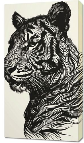 Obraz z serii wnętrza zatytułowany Tygrysi Gwizd. Ta dramatyczna grafika przedstawia tygrysa w stylu linorytu, z wyraźnymi, płynnymi liniami układającymi się w złożony wzór futra. Monochromatyczna paleta, z ciemnymi i jasnymi odcieniami na neutralnym tle, podkreśla majestatyczną postawę i intensywny wzrok tego dzikiego zwierzęcia. Obraz emanuje siłą i elegancją, oddając w pełni królewski charakter tygrysa. Idealny do wnętrz urządzonych w stylu minimalistycznym lub nowoczesnym, będzie także pasował do przestrzeni, które chcą podkreślić motywy przyrodnicze lub eksplorować tematykę ochrony dzikiej przyrody.
