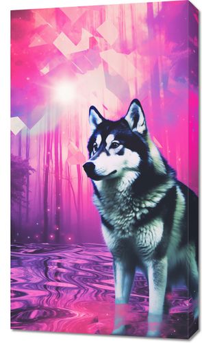 Obraz z serii pop art zatytułowany Wilczy Duch. Ta hipnotyzująca grafika łączy w sobie realistyczny wizerunek wilka z eterycznym, neonowym lasem w tle, co nadaje scenie onirycznego, mistycznego charakteru. Wilk, przedstawiony w pełnym majestacie, stoi na brzegu zaczarowanego jeziora, a tajemnicze, geometryczne kształty unoszą się w powietrzu, dodając kompozycji elementu fantastyki. Wyraziste kolory różu i fioletu tworzą niemal bajkową atmosferę. Obraz jest idealnym wyborem dla miłośników natury i jej mistycznych aspektów, świetnie nadaje się do wnętrz o tematyce przyrodniczej, pokojów dla młodzieży, lub jako unikatowy element dekoracyjny w przestrzeniach współczesnych.